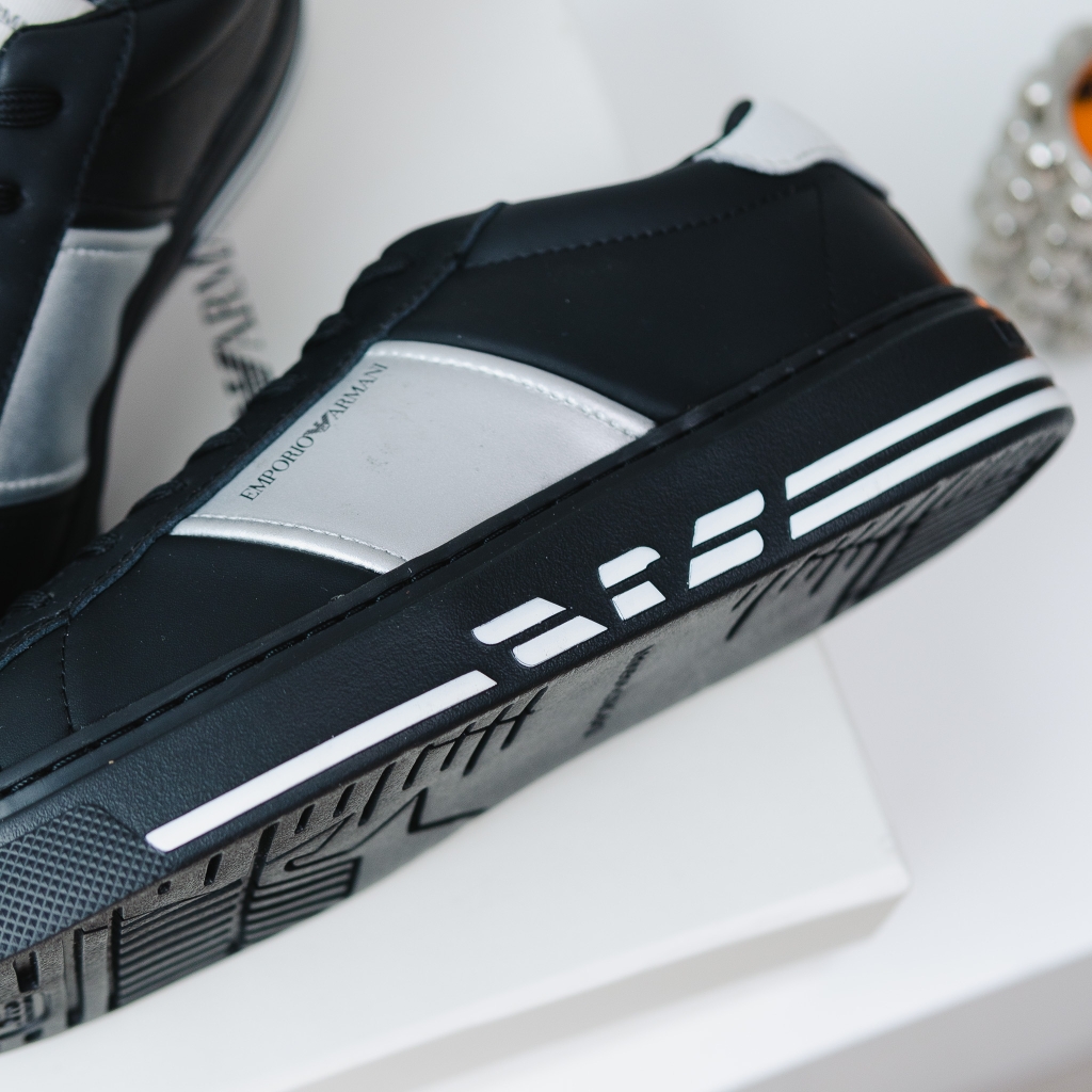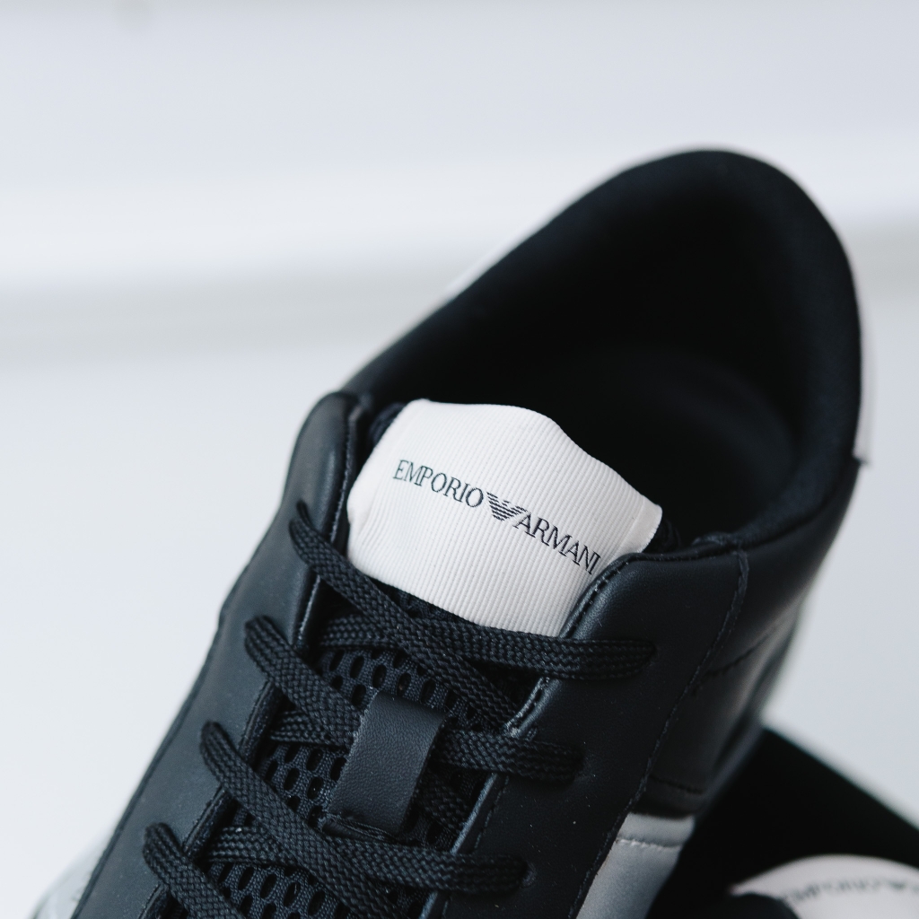 Giày EMPORIO ARMANI đen , sườn miếng da ghi , gót da trắng , đế đen logo trắng